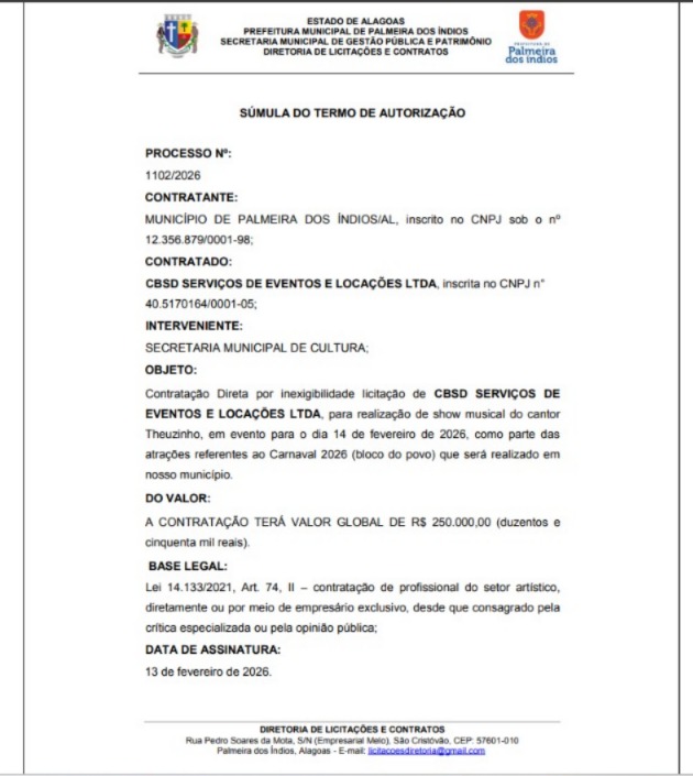 Palmeira dos Índios – A Prefeitura de Palmeira dos Índios publicou no Diário Oficial do Município as contratações por inexigibilidade para atrações do Carnaval do Povo 2026, e um dado salta aos olhos: o show do cantor Theuzinho teve valor global de R$ 250.000,00, disparado o maior entre os contratos divulgados na edição.