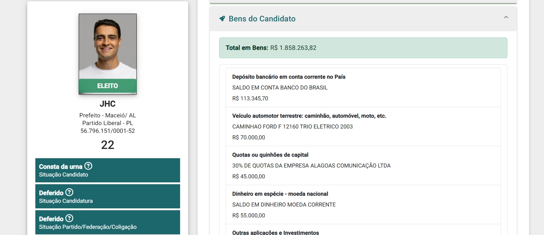 - Maceió – João Henrique Holanda Caldas (PL): R$ 1,8 milhão