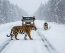 Motorista se depara com tigres-de-amur em estrada nevada