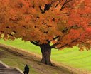 Folhas douradas cobrem o bordo, refletindo o suave calor do outono