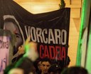 Manifestantes protestam em frente à sede do Banco Master na capital paulista