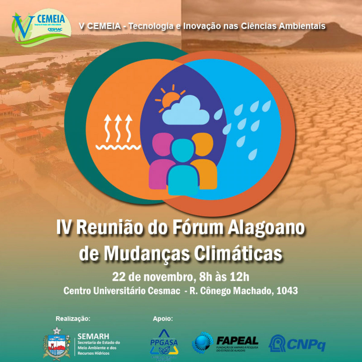 No dia 22 de novembro, acontecerá a IV Reunião do Fórum Alagoano de Mudanças Climáticas, das 8h às 12h, no Complexo de Inovação Pedagógica do Centro Universitário Cesmac. A iniciativa é.da Secretaria de Estado do Meio Ambiente e Recursos Hídricos (Semarh) e visa apresentar as ações do Estado de Alagoas na pasta de Clima.