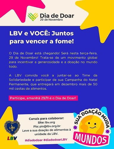 A Legião da Boa Vontade (LBV) também participa desse movimento e intensificará sua campanha de arrecadação de alimentos contra a fome!
