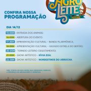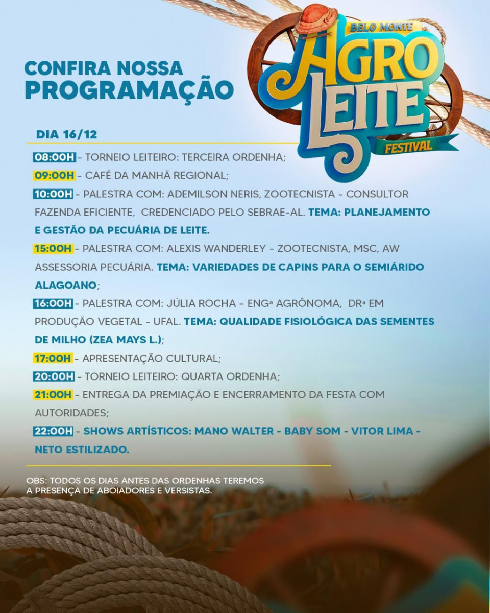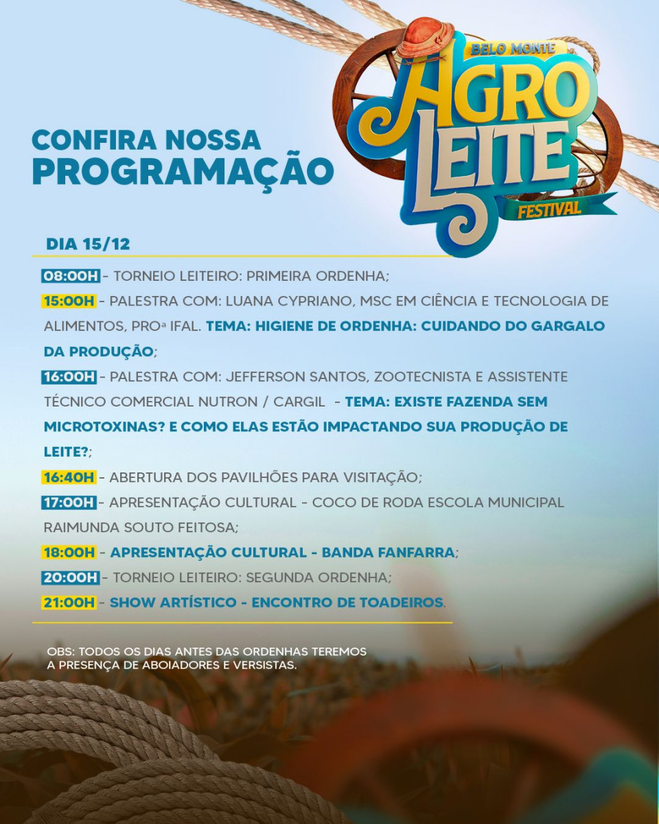 Na quinta, 15, a atração será o encontro de toadeiros e na sexta, 16, as atrações musicais são Mano Walter, banda Baby Som, Victor Lima e Neto Estilizado. Em suas redes sociais, o prefeito Dalminho publicou: “Saiu! Agora é oficial! Confira a programação completa do nosso Agro Leite Festival. Se preparem, esse festival ficará para a história”.