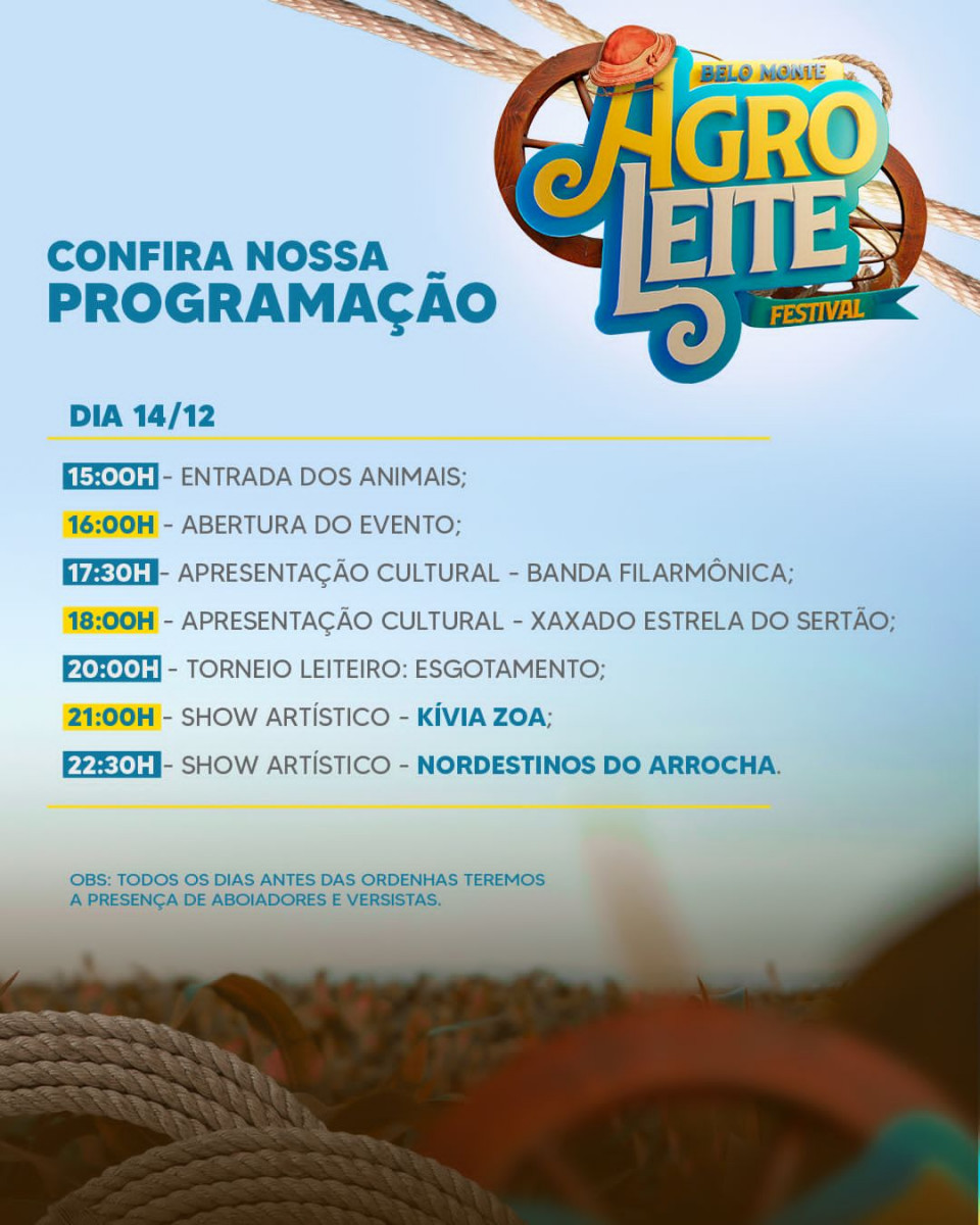 O Belo Monte Agro Leite Festival acontecerá no povoado Olho D’Água Novo e além das atrações artísticas e culturais, terá ainda torneio leiteiro com participação de criadores da região sertaneja de Alagoas. A programação festiva será aberta oficialmente na quarta-feira, dia 14, com shows da banda Nordestino do Arrocha e da cantora Kívia Zôa.
