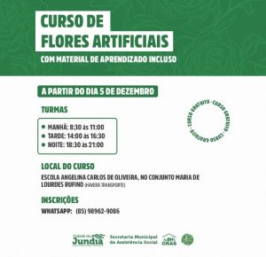 A secretaria de Assistência Social de Jundiá em parceria com a JC Flores abriu inscrições para o curso de flores artificiais em EVA, que tem início previsto para a próxima segunda-feira, 5 de dezembro. O curso é gratuito e com material de aprendizado incluso para os participantes. As aulas serão ministradas na Escola Angelina Carlos de Oliveira, que fica no conjunto Maria de Lourdes.