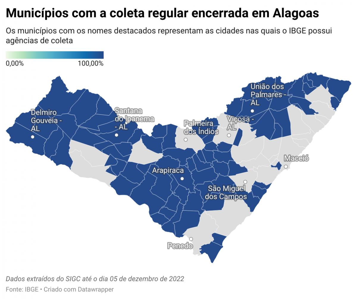 A primeira etapa de coleta do Censo, que se esgota no momento em que todos os setores censitários são percorridos pelos recenseadores, foi encerrada em 78 dos 102 municípios alagoanos (76,5% do total). Agora, uma vez ultrapassada a chamada coleta regular, o IBGE trabalha com o “rescaldo”, a fim de tentar realizar entrevistas nos domicílios em que os moradores estavam ausentes ou não quiseram participar da pesquisa. Seis cidades alagoanas se destacaram pela ampla colaboração da população, zerando o número de recusas e ausências: Água Branca, Jundiá, Mar Vermelho, Minador do Negrão, Pariconha e Quebrangulo.