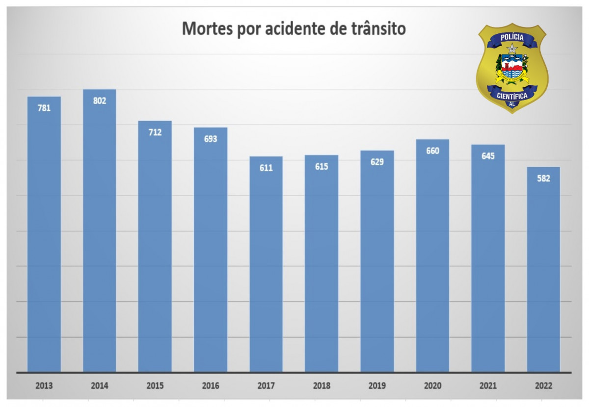 Esse é o menor índice registrado desde 2013, quando se iniciou a série histórica de casos dessa natureza registrados pelos Institutos de Medicina Legal de Maceió e Arapiraca. Fazendo uma correlação com 2014, ano da série onde foi registrado o maior número de óbitos (802), em 2022, o índice de mortes nas estradas e rodovias alagoanas caiu 61%.