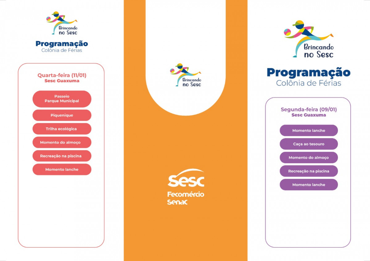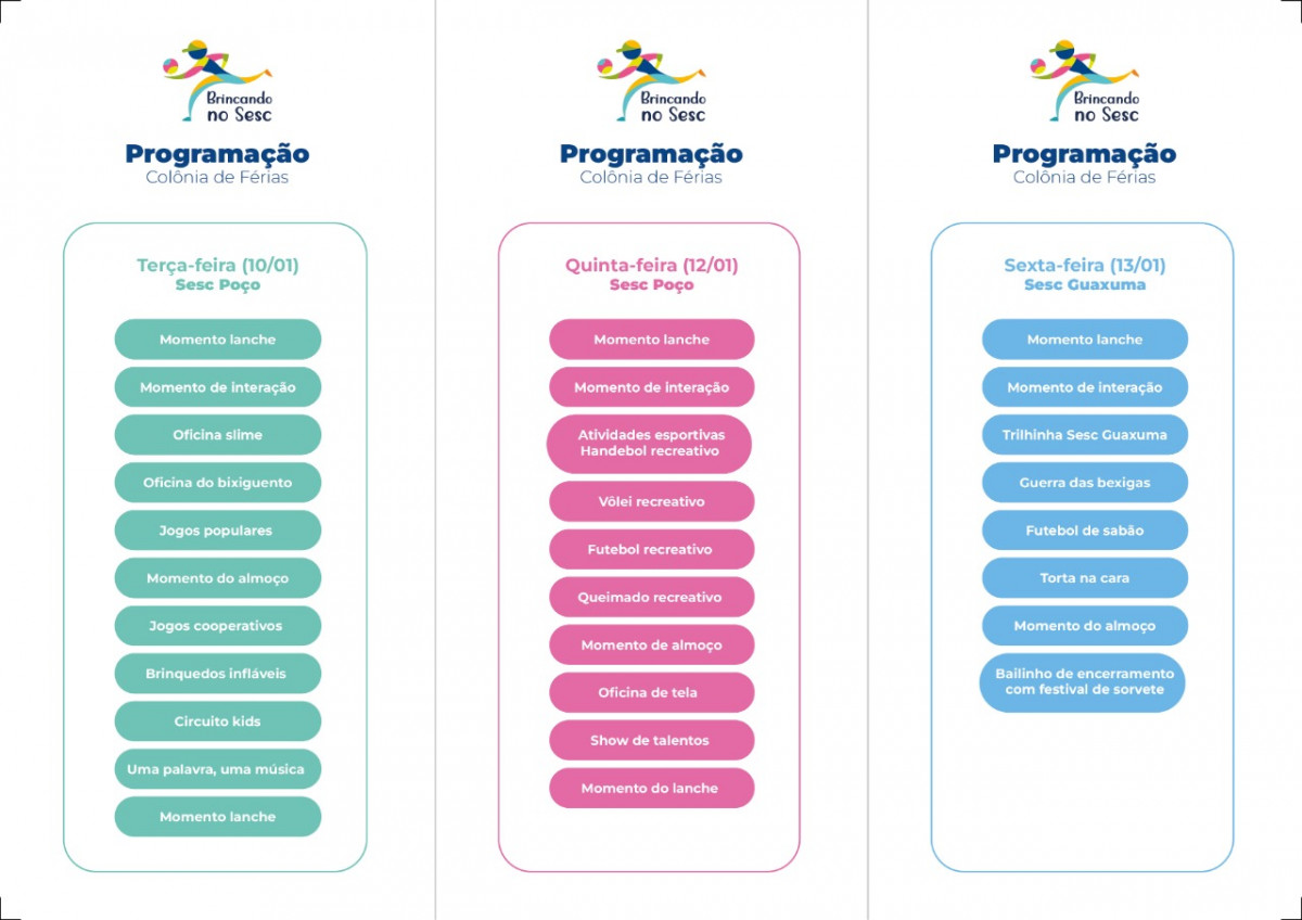 Nos dias 9, 11 e 13 a programação da colônia será realizada no Sesc Guaxuma; já nos dias 10 e 12 ela acontecerá na Unidade Sesc Poço. Durante esses dias, as crianças inscritas participarão de brincadeiras, momentos de socialização, oficinas educativas e muito mais.