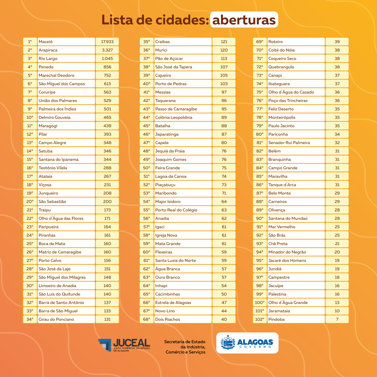Maceió, com 17.933 aberturas, Arapiraca, com 3.327, Rio Largo, com 1.045, Penedo, com 856, Marechal Deodoro, com 752, São Miguel dos Campos, com 613, Coruripe, com 563, União dos Palmares, com 529, Palmeira dos Índios, com 501, e Delmiro Gouveia, com 465, formam o top 10.