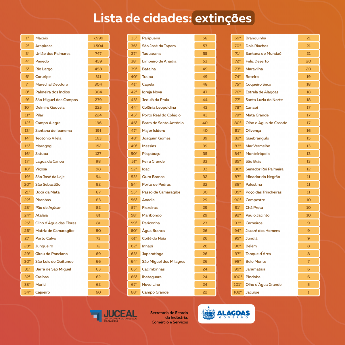 Juceal divulga rankings de aberturas e extinções empresariais para os 102 municípios alagoanos