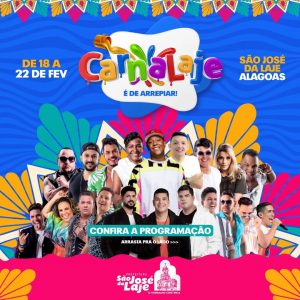A prefeita de São José da Laje, Ângela Vanessa divulgou em suas redes sociais a programação completa do ‘CarnaLaje 2023’ cerca de 25 atrações para todos os gostos, serão cinco dias de muito frevo e folia no carnaval que já virou tradição entre os foliões no Estado de Alagoas, somando mais de 60 horas de shows.