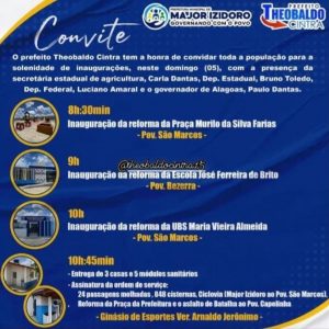 “Major Izidoro com mais avanços ! Convido a todos para a solenidade de inauguração, neste domingo, a partir das 8h30, com a presença do governador de Alagoas, Paulo Dantas. Governo humanizado, junto com o povo!”, disse o prefeito em suas redes sociais.