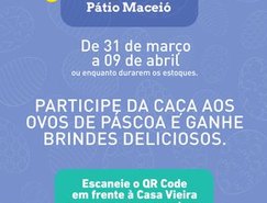 O Shopping Pátio Maceió, espaço de compras, serviços e lazer preferido da parte alta da capital, tem uma missão às crianças nesta Páscoa: encontrar os ovos de chocolates. Para isso, os participantes contam com a ajuda de um aplicativo especial, que torna a brincadeira ainda mais interativa e divertida. Se a ideia é presentear a família na época mais doce do ano, as melhores marcas do empreendimento estão com deliciosas opções para todos os gostos e bolsos.
