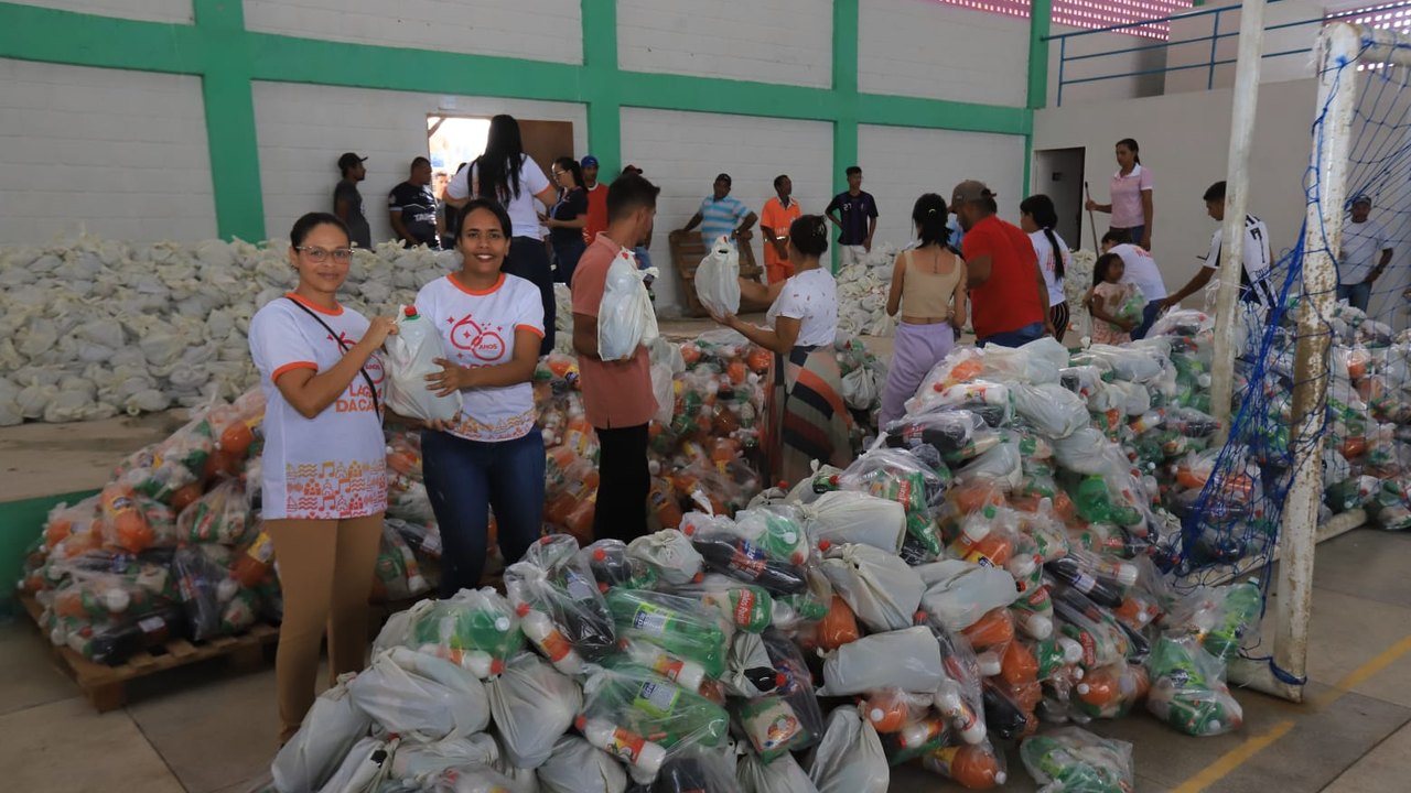 Foram onze pontos de entrega, sendo dez na zona rural e um na cidade. No total foram cerca de 32 toneladas de alimentos distribuídos nos kits, compostos por 1 kg de arroz e um leite de coco de 500 ml, refrigerante, além da estrela principal da Semana Santa: o peixe.