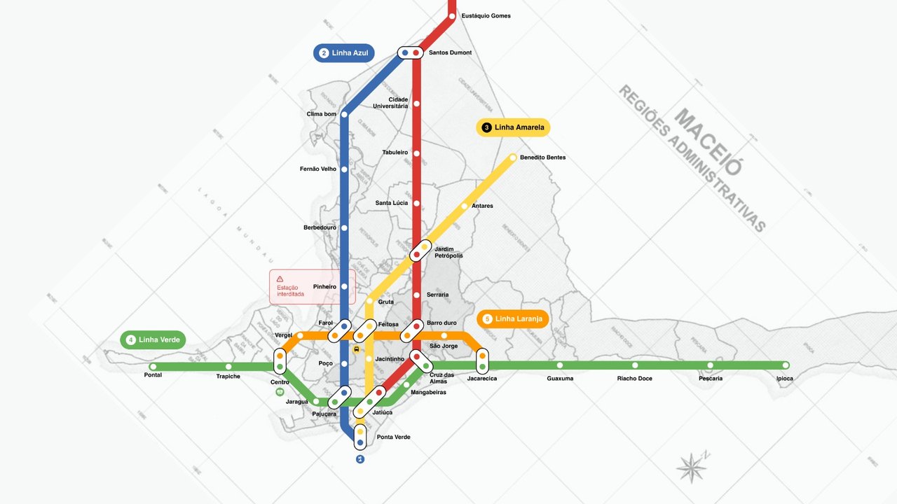 O projeto conta com cinco linhas, todas identificadas por cores. A vermelha, por exemplo, “corta” a cidade ao meio, do Aeroporto à Jatiúca, no mesmo eixo da Avenida Fernandes Lima. A verde, por sua vez, vai de Ipioca ao Pontal, percorrendo a orla da capital. Carlyson, no entanto, esclarece que não fez “nenhum estudo de mobilidade urbana”, tendo proposto apenas uma “exploração visual” da ideia.