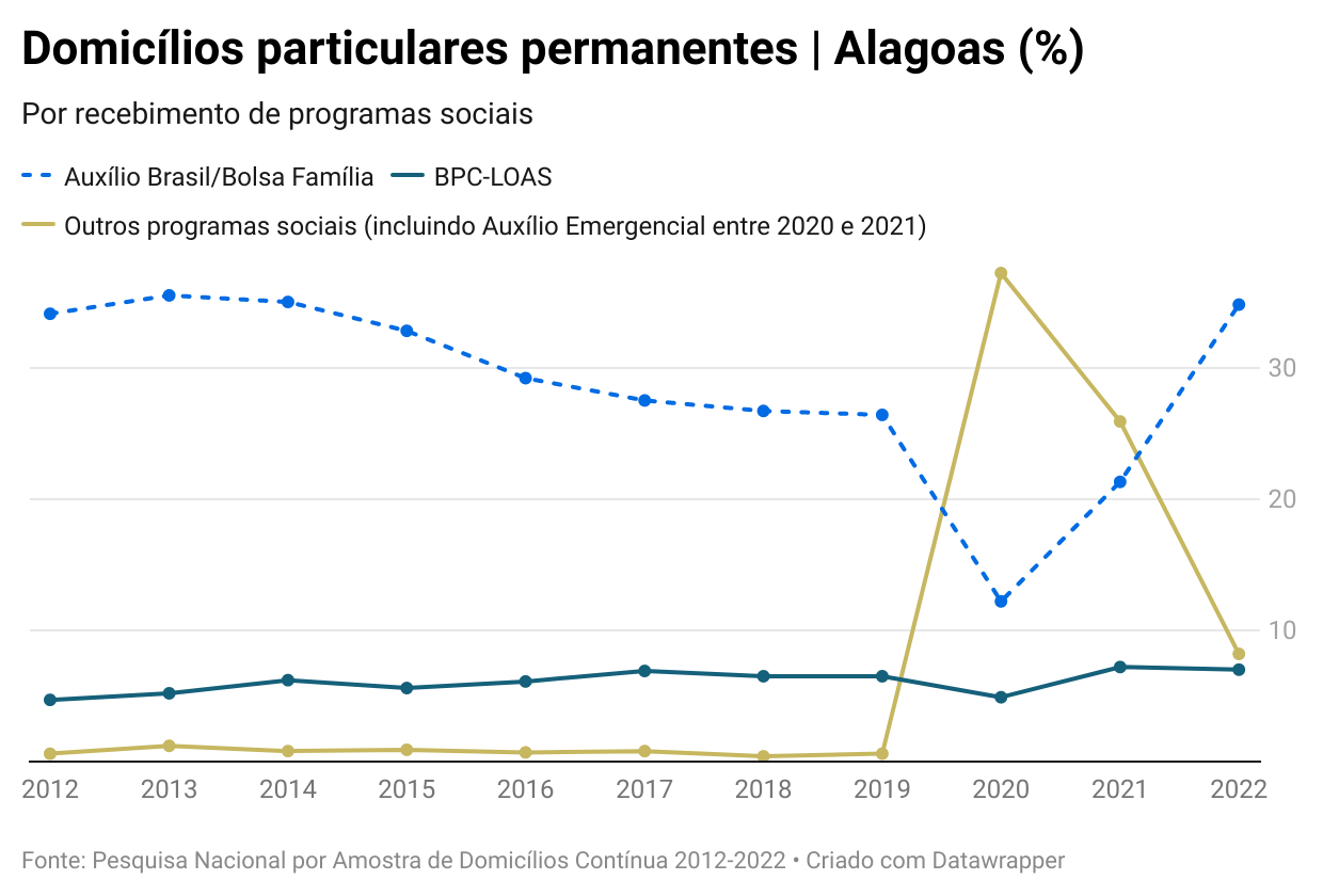 A trajetória dos últimos anos indicava uma queda gradual nesse percentual, que chegou a alcançar 26,4% dos domicílios alagoanos em 2019, ou seja, 8,4 p.p abaixo do observado em 2022. Em números absolutos, estimou-se que 383 mil lares no estado recebiam Auxílio Brasil/Bolsa Família no ano passado.