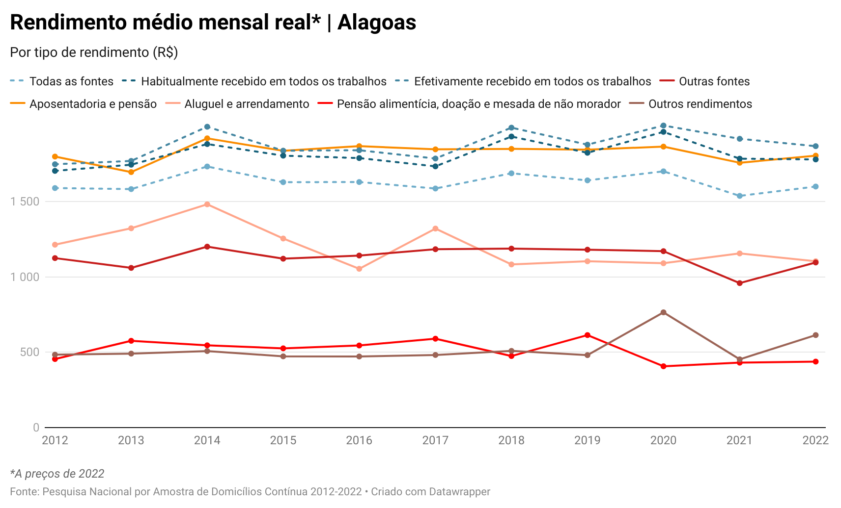 O rendimento médio mensal real da população residente com rendimento de todas as fontes foi de R$ 1.600 em Alagoas, 4,0% maior que em 2021 e 0,6% maior que no início da série, em 2012. O de todos os trabalhos ficou em R$ 1.780, caindo 0,3%. Já o de outras fontes cresceu 14,2%, alcançando R$ 1.096 em 2022, com o item aposentadoria e pensão mantendo-se com a maior média em 2022 (R$1.805) e destaque para o item outros rendimentos, subindo de R$ 453 para R$ 614 (alta de 35,5%), alcançando o segundo maior valor da série.