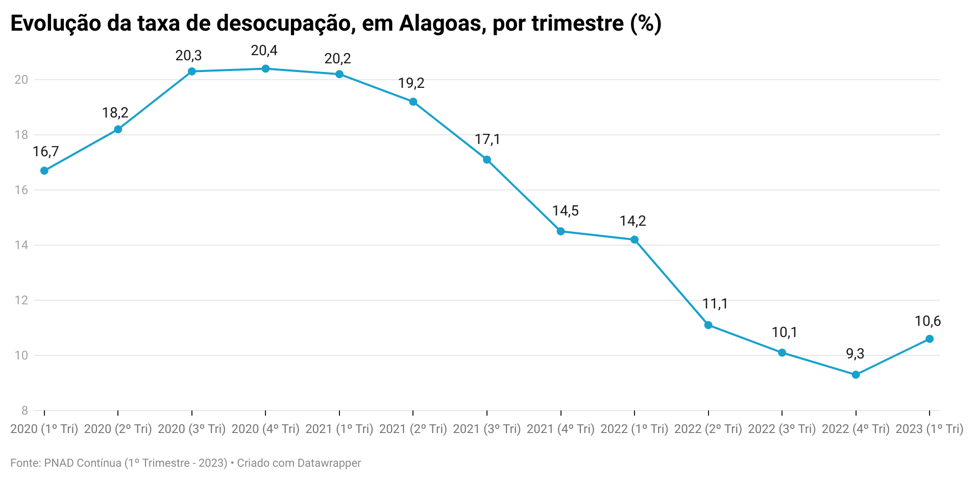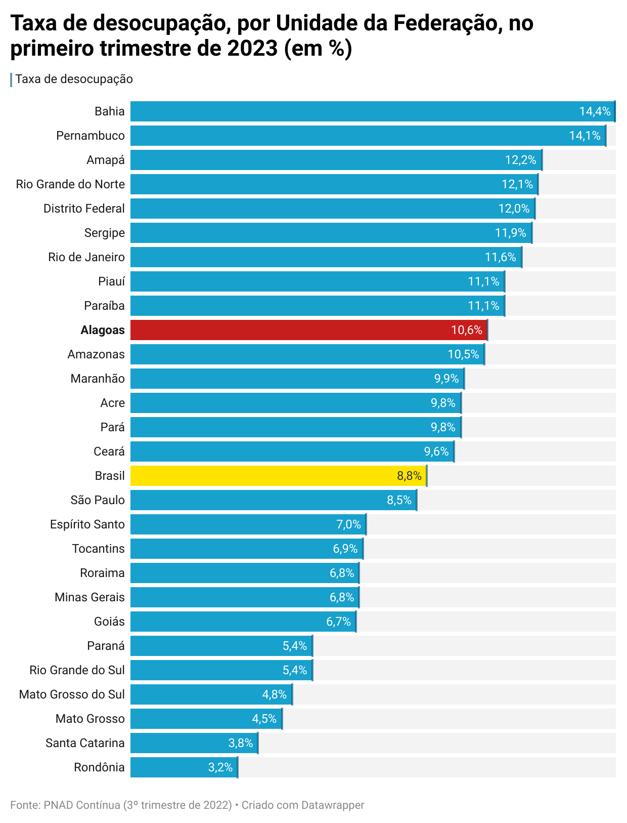 Na comparação com as demais unidades da federação, Alagoas apresentou a décima maior taxa de desocupação e, na região Nordeste, apresentou resultados melhores que Bahia (14,4%), Pernambuco (14,1%), Rio Grande do Norte (12,1%), Sergipe (11,9%), Piauí (11,1%) e Paraíba (11,1%).