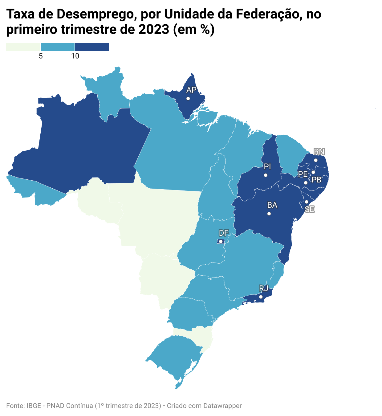 No Brasil, a taxa de desocupação subiu para 8,8% no primeiro trimestre frente ao trimestre anterior e essa expansão foi disseminada por 16 unidades da federação. De acordo com a analista da pesquisa Alessandra Brito, no primeiro trimestre, o aumento da desocupação e a queda da ocupação, de forma simultânea, resultaram no crescimento da taxa de desocupação nas grandes regiões, assim como ocorreu no resultado nacional.
