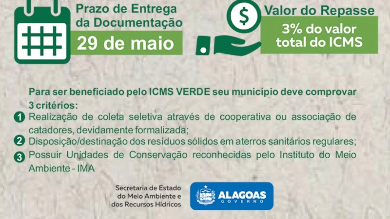 O Governo de Alagoas, por meio da Secretaria Estadual do Meio Ambiente e dos Recursos Hídricos (Semarh), está com o prazo aberto para o cadastro das prefeituras no programa ICMS Verde até o dia 29 de maio. O ICMS Verde é um instrumento fundamental para promover a preservação ambiental e incentivar a sustentabilidade em todo o território alagoano.