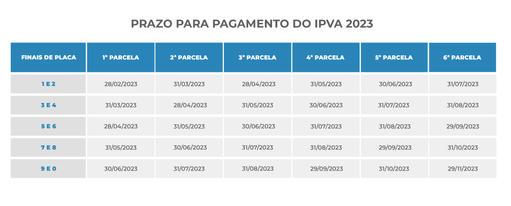 Cada final de placa possui uma data-limite para pagamento da cota única sem desconto ou da primeira parcela. Vale ressaltar que as placas de finais 9 e 0 seguirá até o dia 30 de junho para efetuar o pagamento.