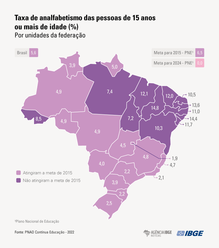 Em 2022, entre as pessoas pretas ou pardas com 15 anos ou mais de idade, 15,7% eram analfabetas, enquanto entre as pessoas brancas, a taxa observada foi de 11,2%. No grupo etário de 60 anos ou mais, a taxa de analfabetismo dos brancos alcançou 26,8%, enquanto entre pretos ou pardos ela chegava a 41,3%.Na análise por sexo, a taxa de analfabetismo das mulheres de 15 anos ou mais, em 2022, foi de 13,2%, enquanto a dos homens foi de 15,7%. Entre os idosos, a taxa das mulheres foi de 35,7%, ficando acima da dos homens (39,3%).