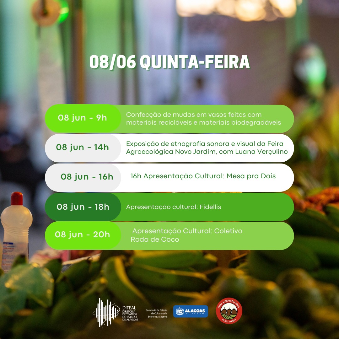 Quinta-feira, 08 de junho, feriado de Corpus Christ, mais um dia da programação da Semana do Meio Ambiente, evento promovido pela Diretoria de Teatros do Estado de Alagoas, Diteal, em parceria com a Feira Agroecológica Novo Jardim, juntos, promovendo educação, conscientização sobre meio ambiente e cultura.