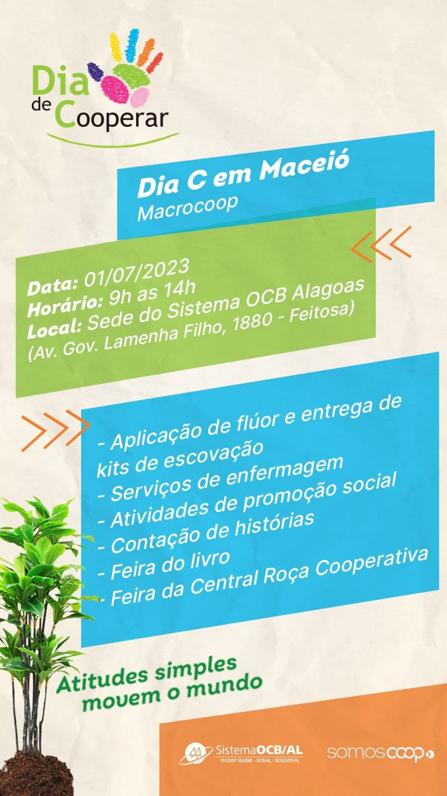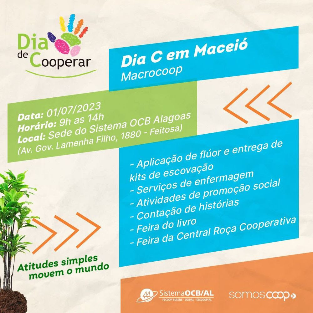 Além do dia 1º na capital alagoana, no mês de julho, terá Dia de Cooperar para mais duas cooperativas: Coopemcs (Colégio Inovar/Atalaia) e Coopgirau (Girau do Ponciano). A expectativa é atender mais de mil pessoas nesses eventos. “O Dia C é uma atividade que traz grandes benefícios não só para cooperados, mas comunidades do entorno também são contempladas com os serviços oferecidos”, concluiu a presidente do Sistema OCB Alagoas, Márcia Túlia Pessôa.