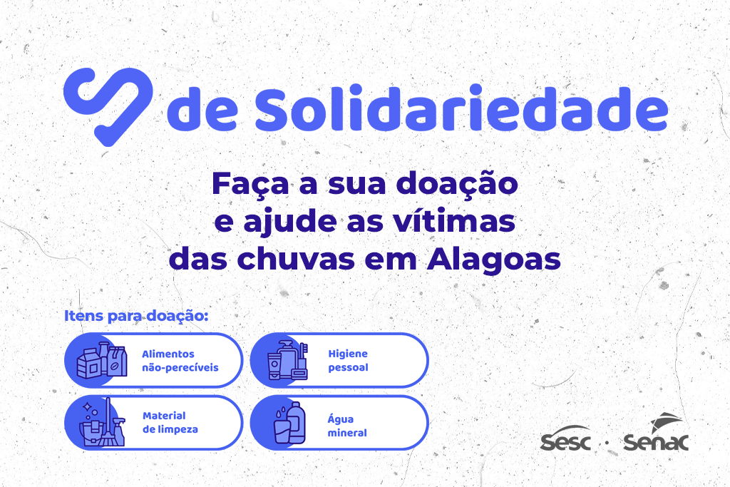 Com mais de 23 mil pessoas desabrigadas por causa das fortes chuvas que atingiram o estado de Alagoas, o Sesc e o Senac estão arrecadando doações para essas famílias que precisaram deixar, temporariamente, suas casas. Para fazer parte dessa corrente de solidariedade, você pode doar alimentos não-perecíveis, água mineral, produtos de limpeza e produtos de higiene pessoal em qualquer unidade das Instituições.
