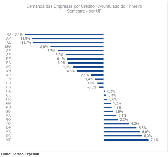Ao analisar as Unidades Federativas (UFs) do país, o levantamento aponta que os consumidores do Amapá tiveram a maior retração na demanda por crédito considerando os seis primeiros meses de 2023. Em segundo lugar ficou o Rio de Janeiro, seguido por Alagoas, Rio Grande do Norte e Piauí, respectivamente. Confira a seguir o gráfico com o levantamento completo: