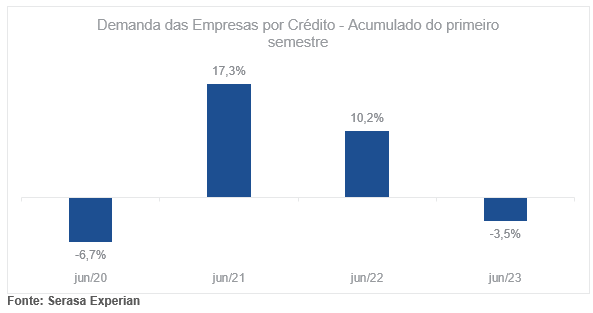 Na visão nacional, o indicador mostrou que a procura por recurso financeiro no primeiro semestre de 2023 caiu 3,5% comparado ao mesmo período de 2022, sendo a primeira baixa registrada desde o acumulado dos primeiros 6 meses da pandemia, em 2020. Confira os dados completos no gráfico abaixo: