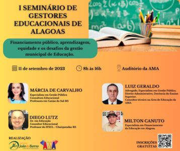 No dia 11 de setembro de 2023, a Associação dos Municípios Alagoanos (AMA) será o palco do “I Seminário de Gestores Educacionais de Alagoas – Edição Maceió”. Uma realização do Instituto João de Barro em parceria com a AMA, o evento está agendado para começar às 8h, no auditório da associação, em Maceió/AL.