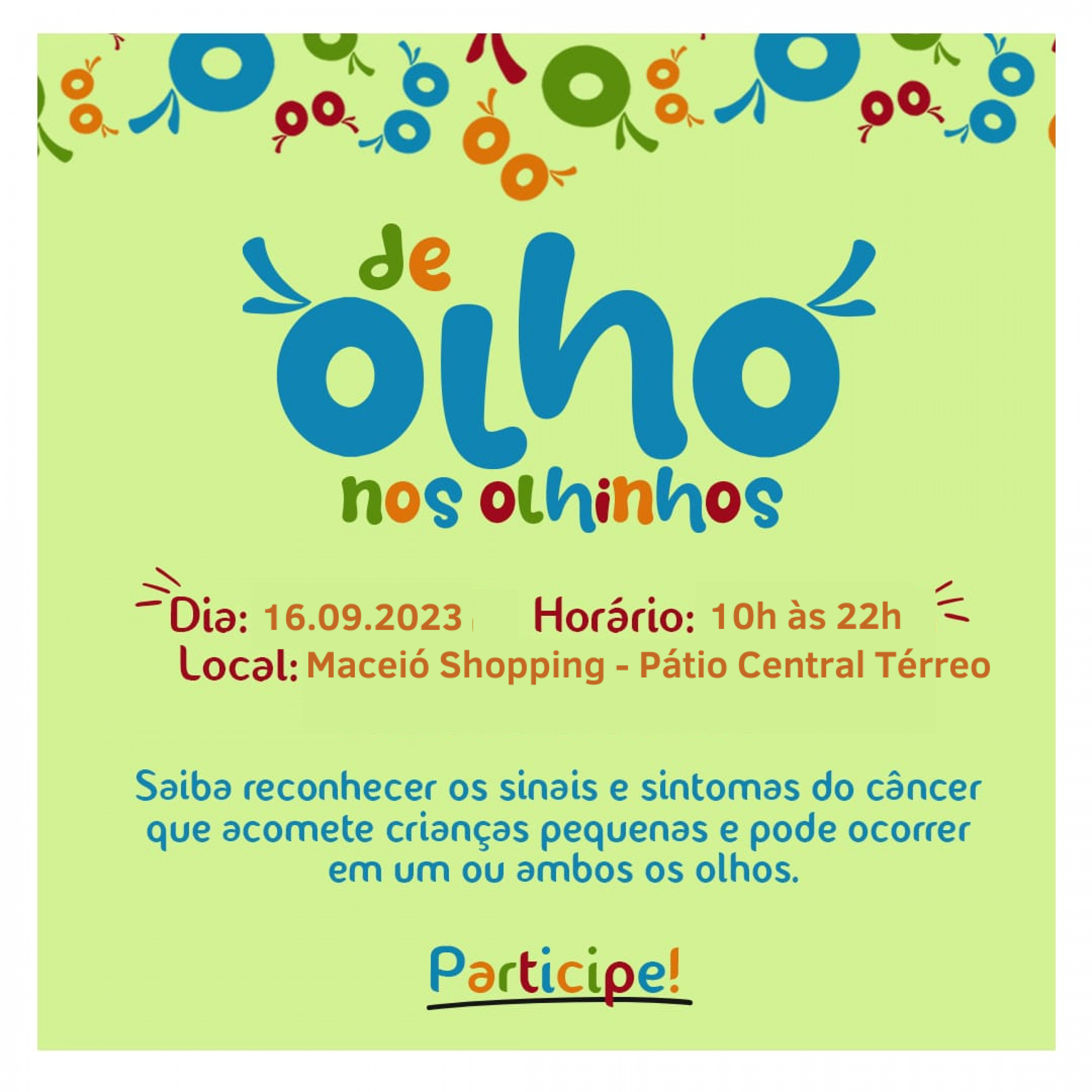 A Universidade Estadual de Ciências da Saúde de Alagoas (Uncisal) e o Hospital Veredas abraçaram a campanha “De Olho nos Olhinhos”, que tem o objetivo de conscientizar e alertar sobre o retinoblastoma, um tumor ocular que acomete crianças entre 0 e 5 anos. O lançamento da campanha acontece neste sábado (16/09), às 10h, no pátio central térreo do Maceió Shopping, em Mangabeiras.