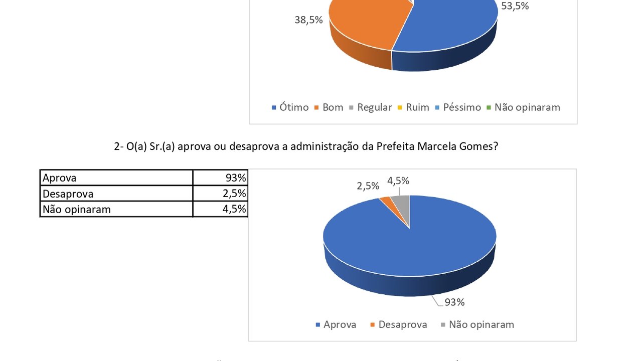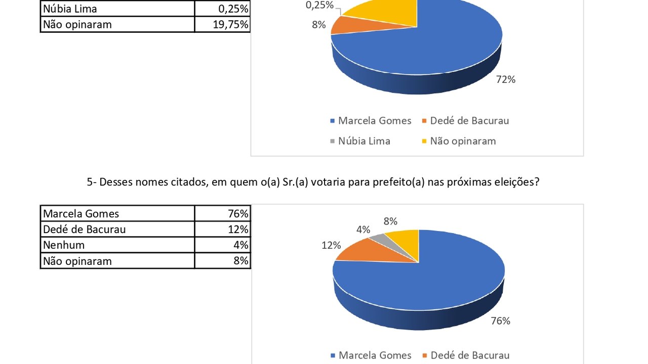 Em relação a disputa eleitoral de 2024, a prefeita Marcela lidera as intenções de voto, tanto no quesito espontâneo quando no estimulado. Na pergunta se as eleições fossem hoje, em quem o senhor ou a senhora votaria para prefeito (a), Marcela Gomes lidera com 72%, vindo em seguida Dedé de Bacurau com 8%, a vereadora Nubia Lima com 0,25% e 19,25% não opinou.