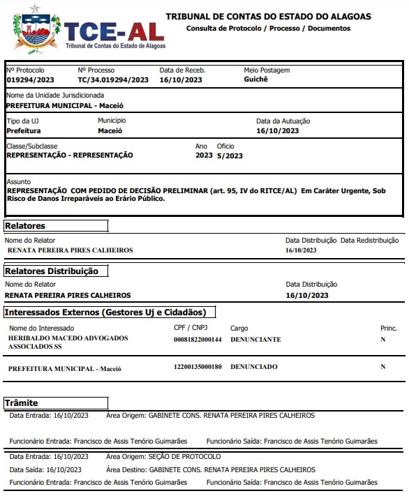 A representação, apresentada pelos Heribaldo Macedo Advogados, foi encaminhada com caráter de urgência, alegando risco de danos "irreparáveis" ao erário público. A conselheira Renata Pereira Pires Calheiros foi sorteada como relatora para acompanhar o caso.