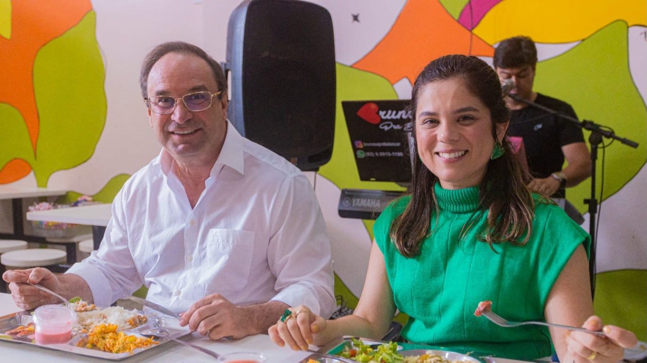 O prefeito Luciano Barbosa enfrentou fila para o almoço ao lado da secretária municipal de Desenvolvimento Social, Fabrícia Galindo.