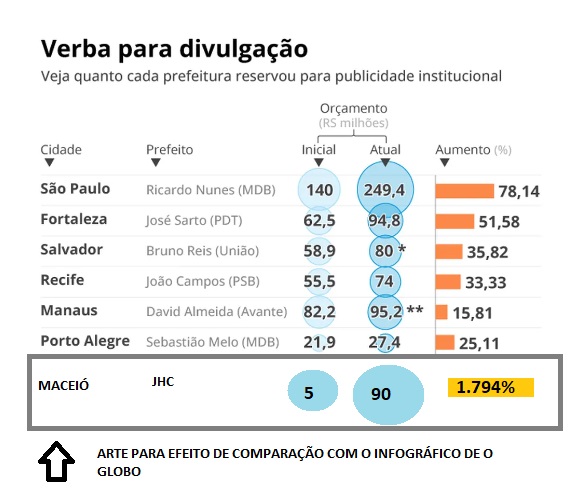 Proporcionalmente, a gestão de JHC também é a que mais gasta com propaganda em todo o Brasil. Para se ter uma ideia, o município de São Paulo tem 12,3 milhões de habitantes e um PIB R$ 747 bilhões. A população de São Paulo é 12 vezes maior do que a de Maceió e o PIB é quase 30 vezes maior do que a capital de Alagoas (R$ 27 bilhões).