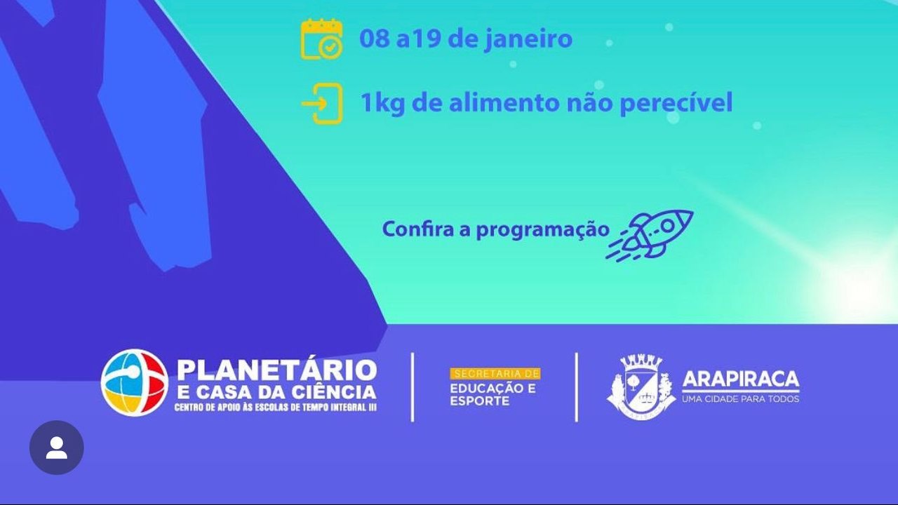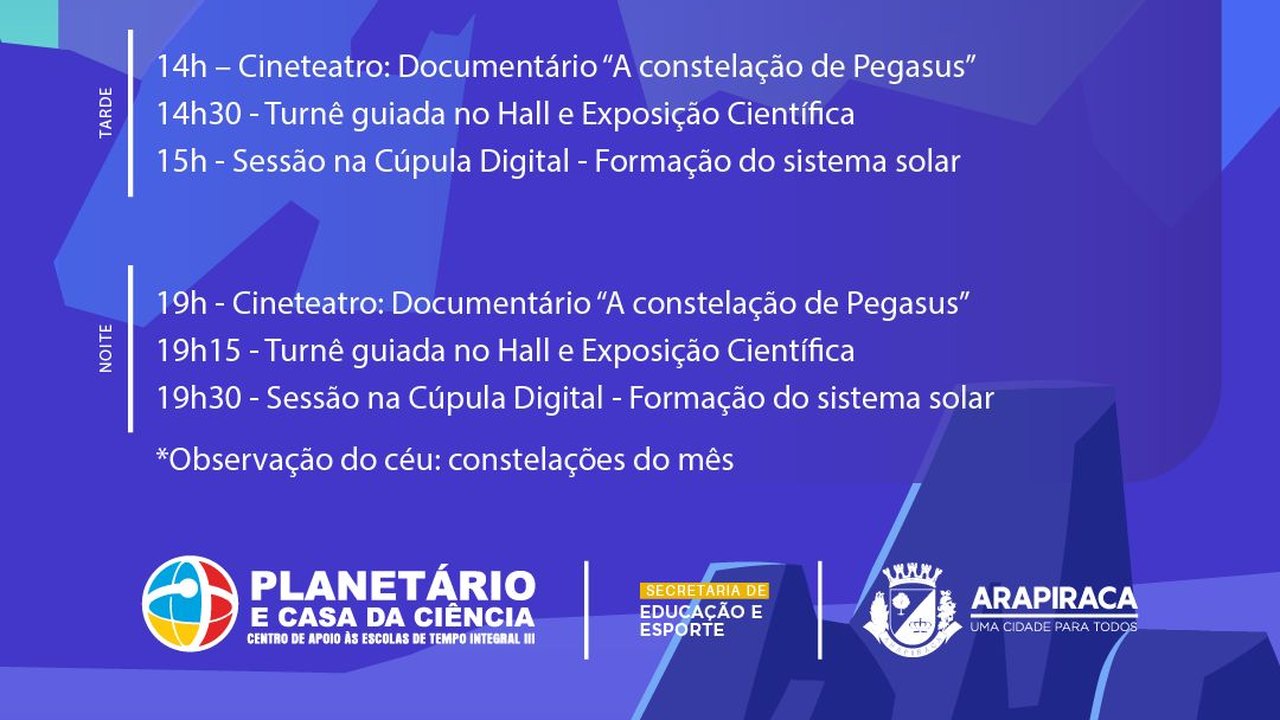 Entre os dias 8 e 19 de janeiro, a Prefeitura de Arapiraca, por meio da Secretaria Municipal de Educação, irá realizar, no Planetário Municipal e Casa da Ciência, mais uma edição das Férias Astronômicas.