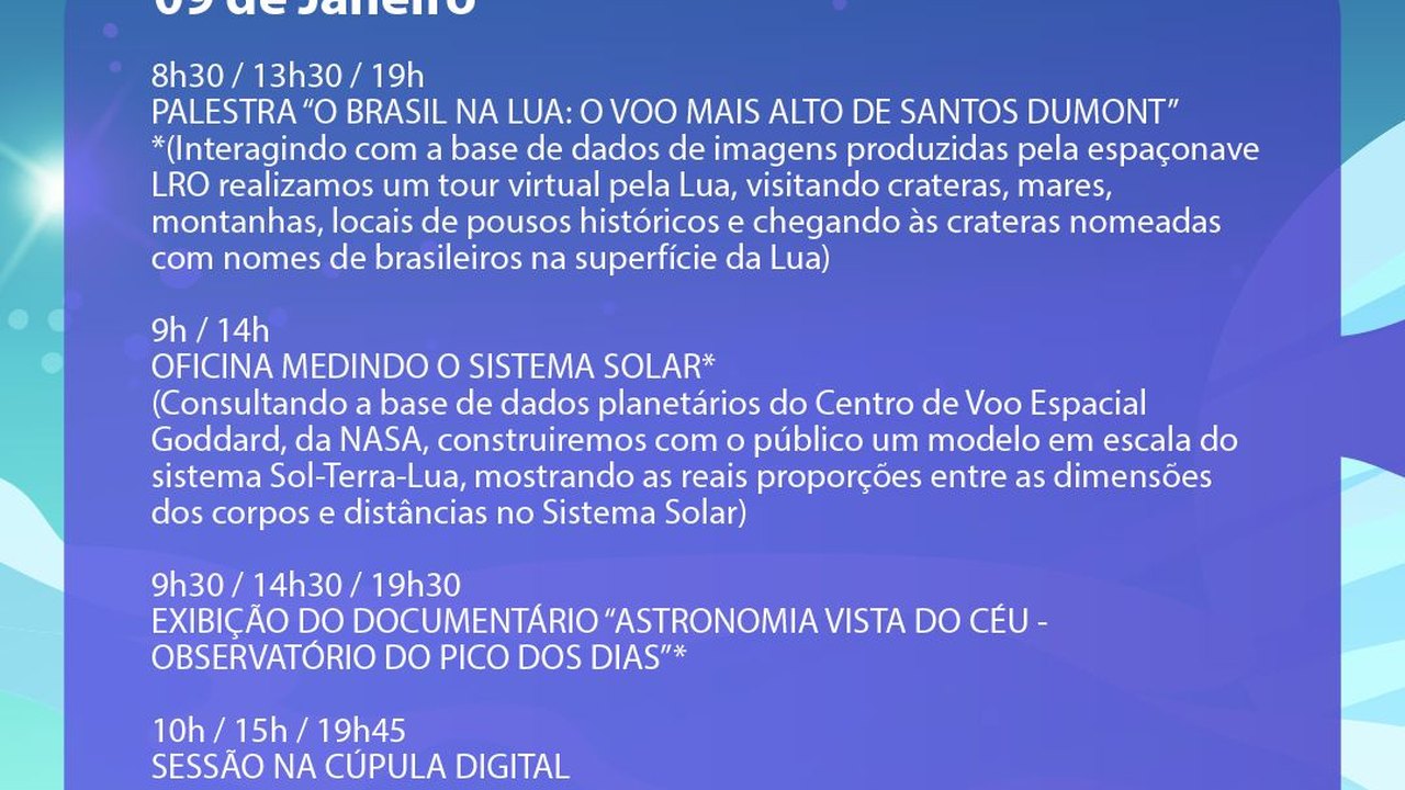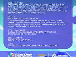 Haverá, também, palestras, exibição de documentários, oficinas, sessão na cúpula digital e observação astronômica no mirante do Planetário Municipal e Casa da Ciência.