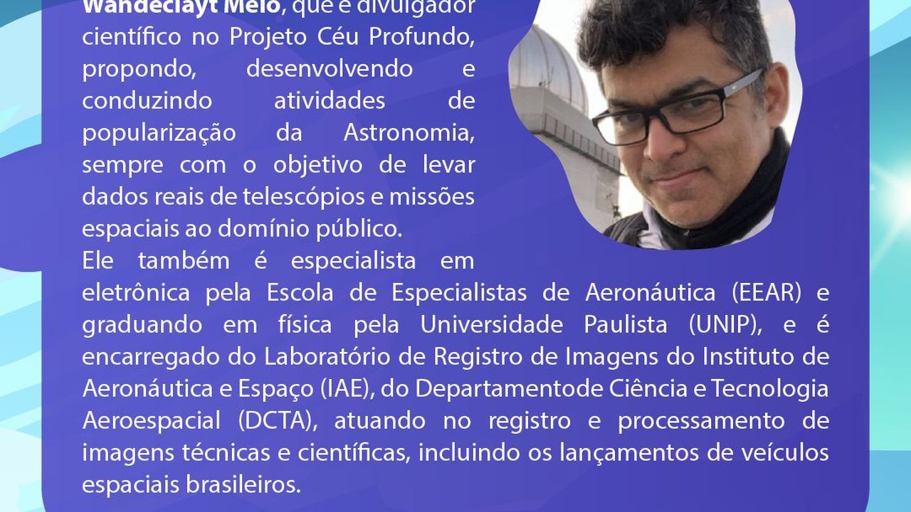 Este ano, as Férias Astronômicas contarão com a presença do divulgador do Projeto Céu Profundo, Wandeclayt Melo, propondo, desenvolvendo e conduzindo atividades de popularização da Astronomia.