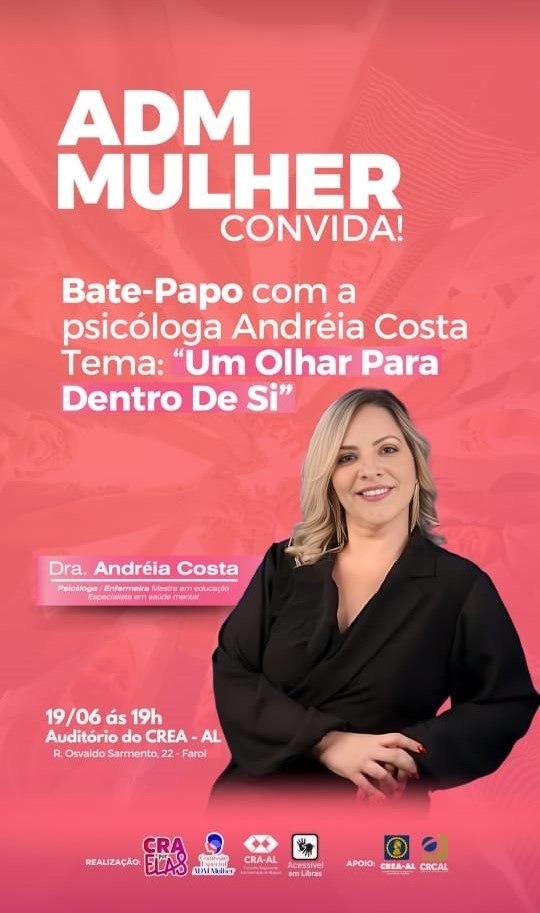 A Comissão Especial ADM Mulher do Conselho Regional de Administração de Alagoas (CRA-AL) tem o prazer de anunciar o evento "Um Olhar para Dentro de Si", que será realizado no dia 19 de junho, às 19h, no auditório do CREA-AL. Este evento contará com um bate-papo enriquecedor com a psicóloga Andréia Costa.