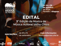 Compositores e intérpretes alagoanos já estavam na expectativa, não é não? Pois bem, a espera acabou porque o Festival de Música de Penedo (Femupe) da Universidade Federal de Alagoas lançou o edital da 3ª Mostra de Música Autoral do Velho Chico. Fiquem ligados porque as inscrições vão até 15 de setembro, exclusivamente pela internet.