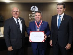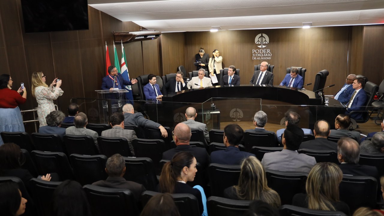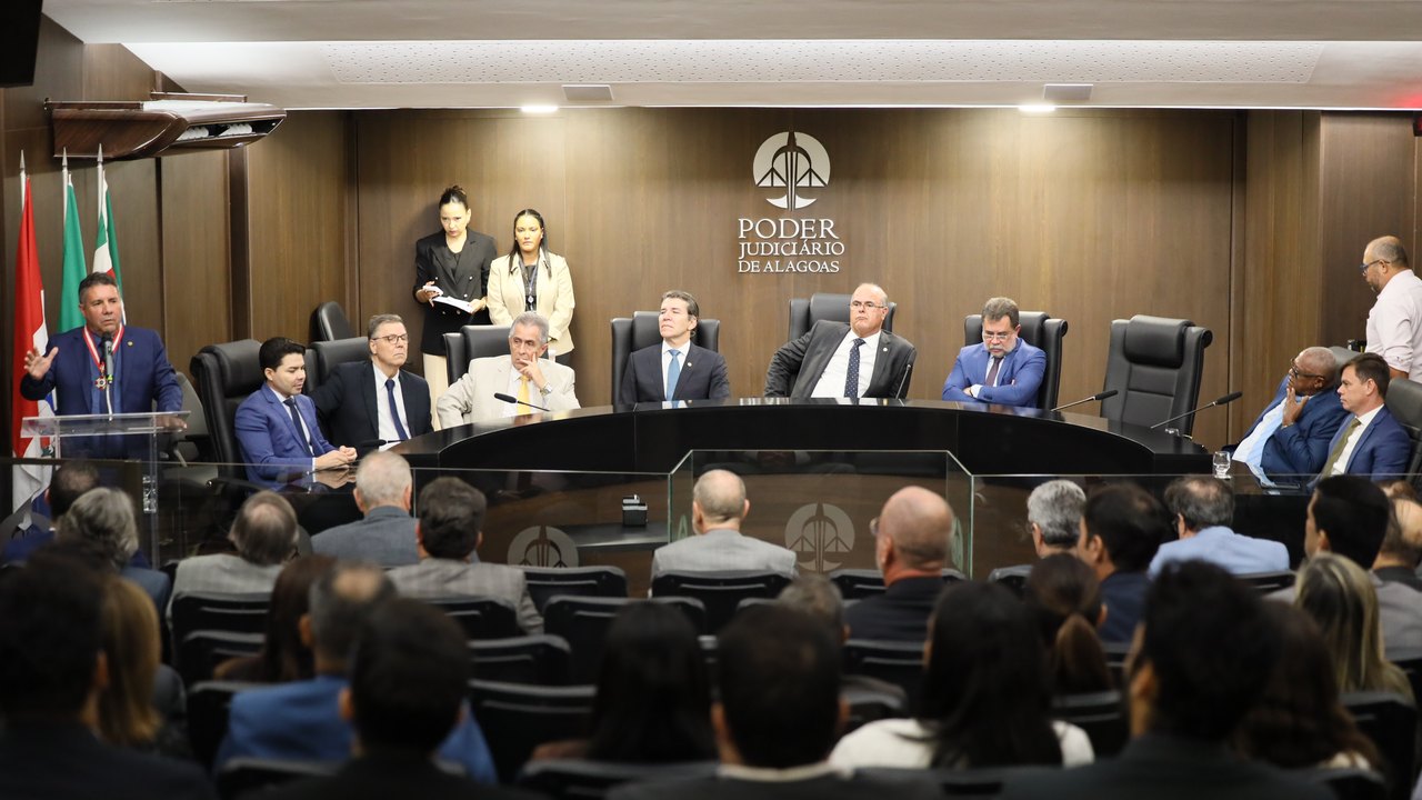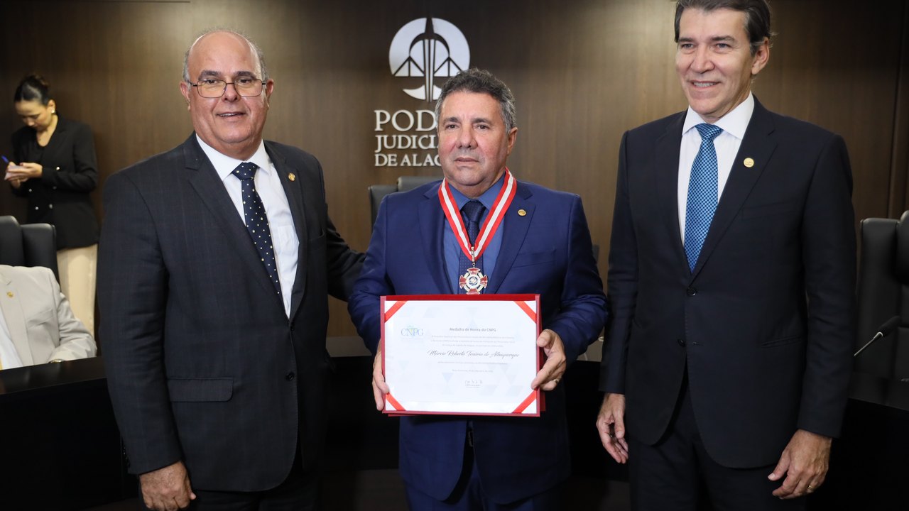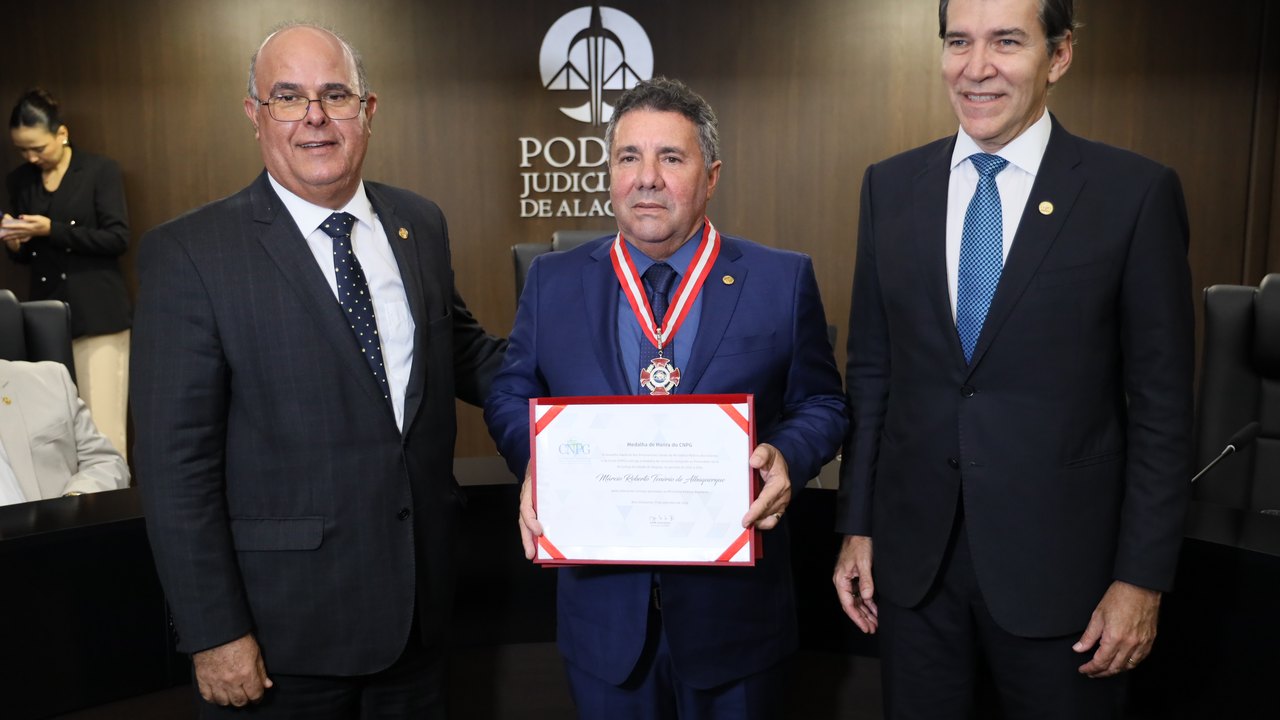 O Conselho Nacional de Procuradores-Gerais dos Ministérios Públicos dos Estados e da União (CNPG) homenageou, nesta terça-feira (17), o ex-procurador-geral de Justiça (PGJ), Márcio Roberto Tenório de Albuquerque, que atualmente ocupa assento no Tribunal de Justiça de Alagoas (TJAL) como desembargador. A solenidade foi prestigiada pelo atual chefe do Ministério Público do Estado de Alagoas (MPAL), Lean Araújo, pelo corregedor-geral, Maurício Pitta, além de outros membros da instituição. Na ocasião, o presidente do Conselho e atual PGJ do MP de Minas Gerais, Jarbas Soares Júnior, entregou a Márcio Roberto a Medalha do Mérito do CNPG.