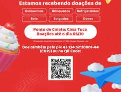 Além dos brinquedos, as pessoas que quiserem também podem fazer doações de guloseimas, refrigerantes, bolos, salgados e doces. As entregas podem ser feitas até 06/10 na Casa Tuca, que fica na Rua Santo Antônio, nº 980, Vergel do Lago, Maceió. Quem decidir doar alguma quantia em dinheiro, pode fazer um pix para: 43.134.521/0001-44 (CNPJ).