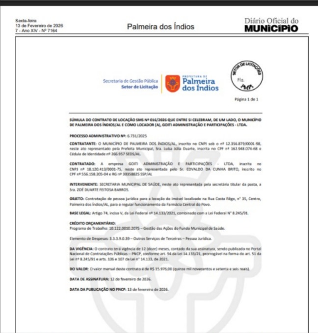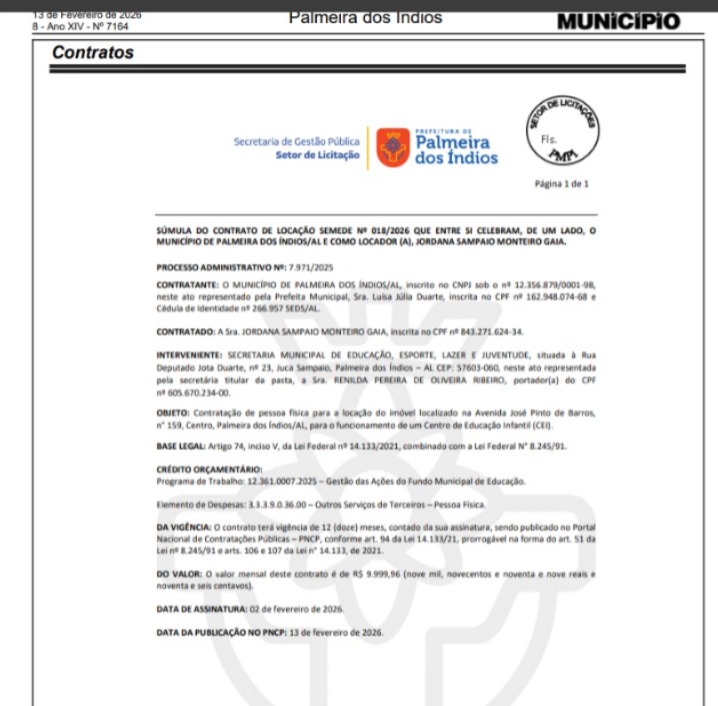Palmeira dos Índios – Dois contratos de locação publicados no Diário Oficial do Município reacendem a discussão sobre os valores pagos pela Prefeitura com aluguéis de imóveis para funcionamento de serviços públicos. Nos bastidores, a avaliação é direta: os números são considerados um absurdo diante da realidade financeira da cidade.