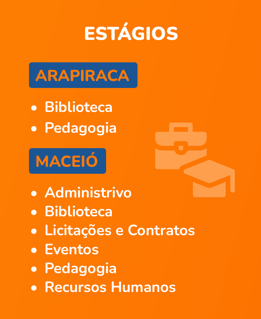 • Em Maceió: estágios na área Administrativa e de Biblioteca, Licitações e Contratos, Eventos, Pedagogia e Recursos Humanos.