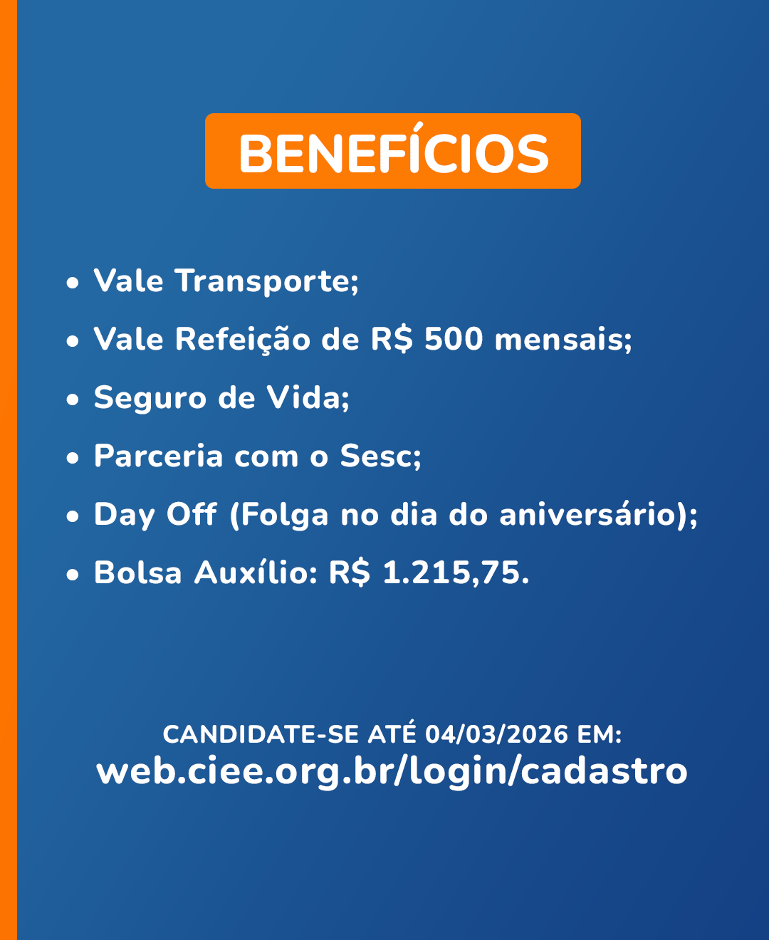 Para os cargos de estágio, os interessados devem se inscrever pela plataforma do CIEE: https://web.ciee.org.br/login/cadastro