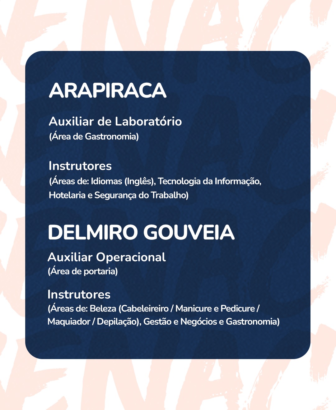 • Instrutores: nas áreas de Beleza (Cabeleireiro/ Manicure e Pedicure / Maquiador), Gastronomia (Serviços de Sala e Bar; Confeitaria) e Saúde (Análises Clínicas).