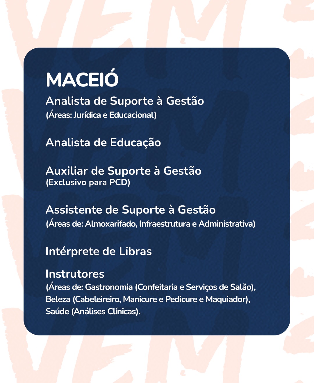 • Assistente de Suporte à Gestão: nas áreas Administrativa, Almoxarifado, Infraestrutura;
